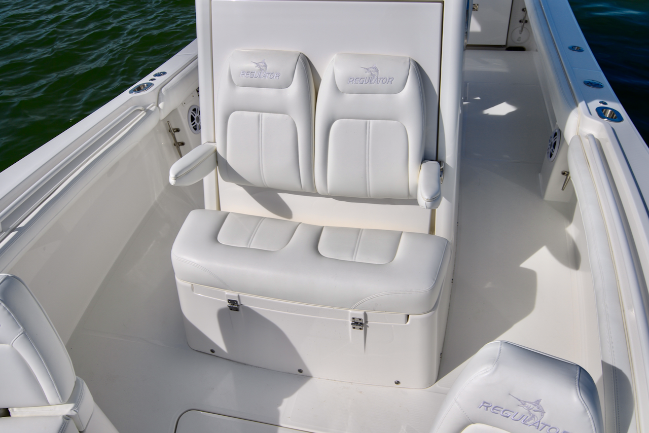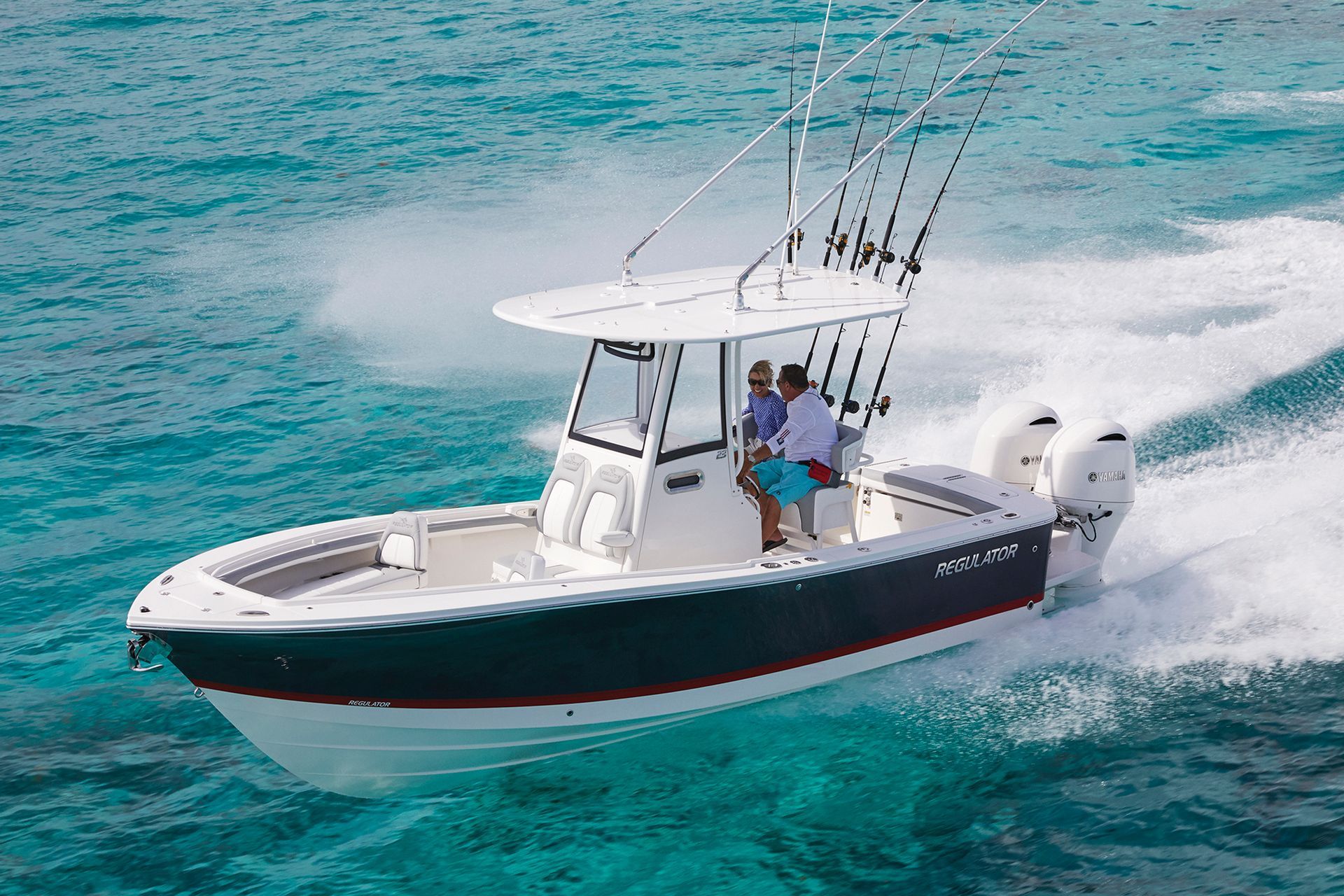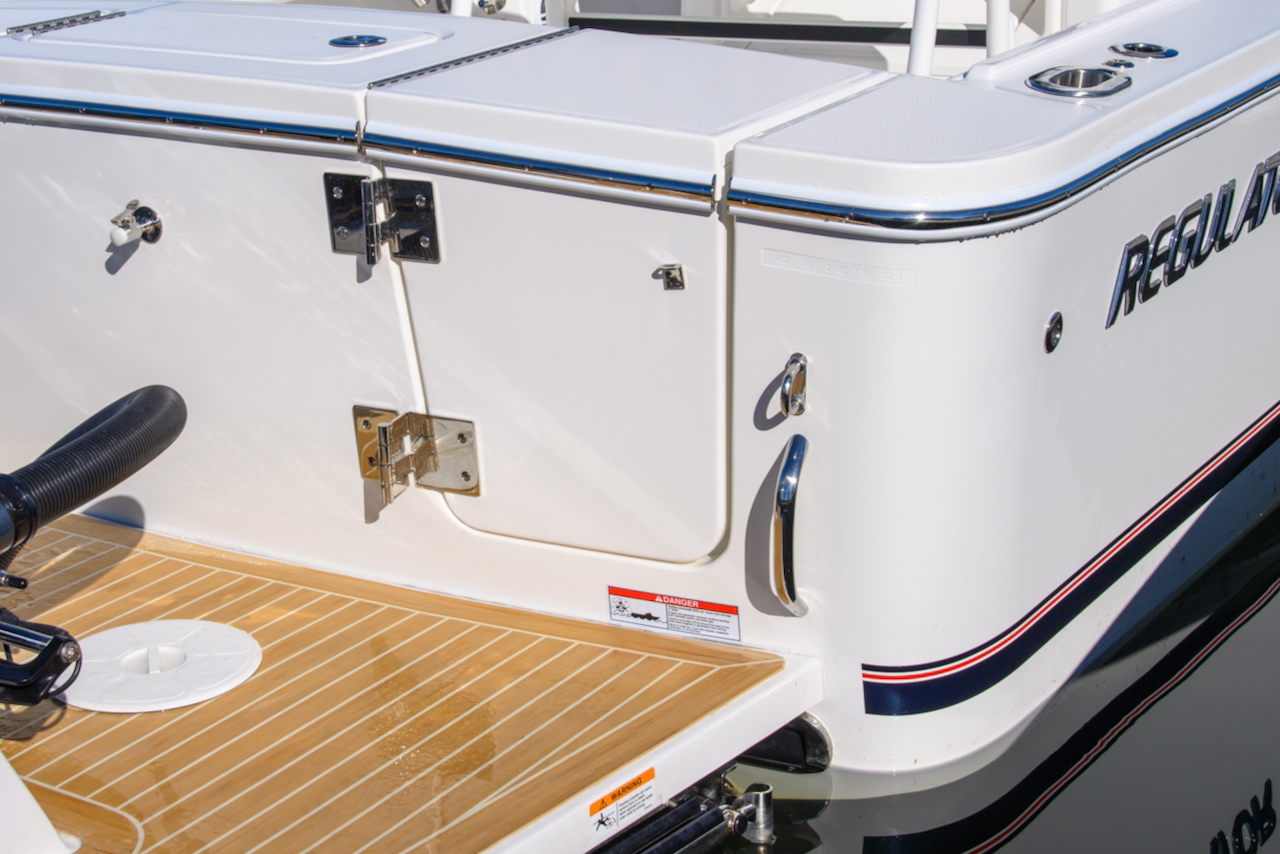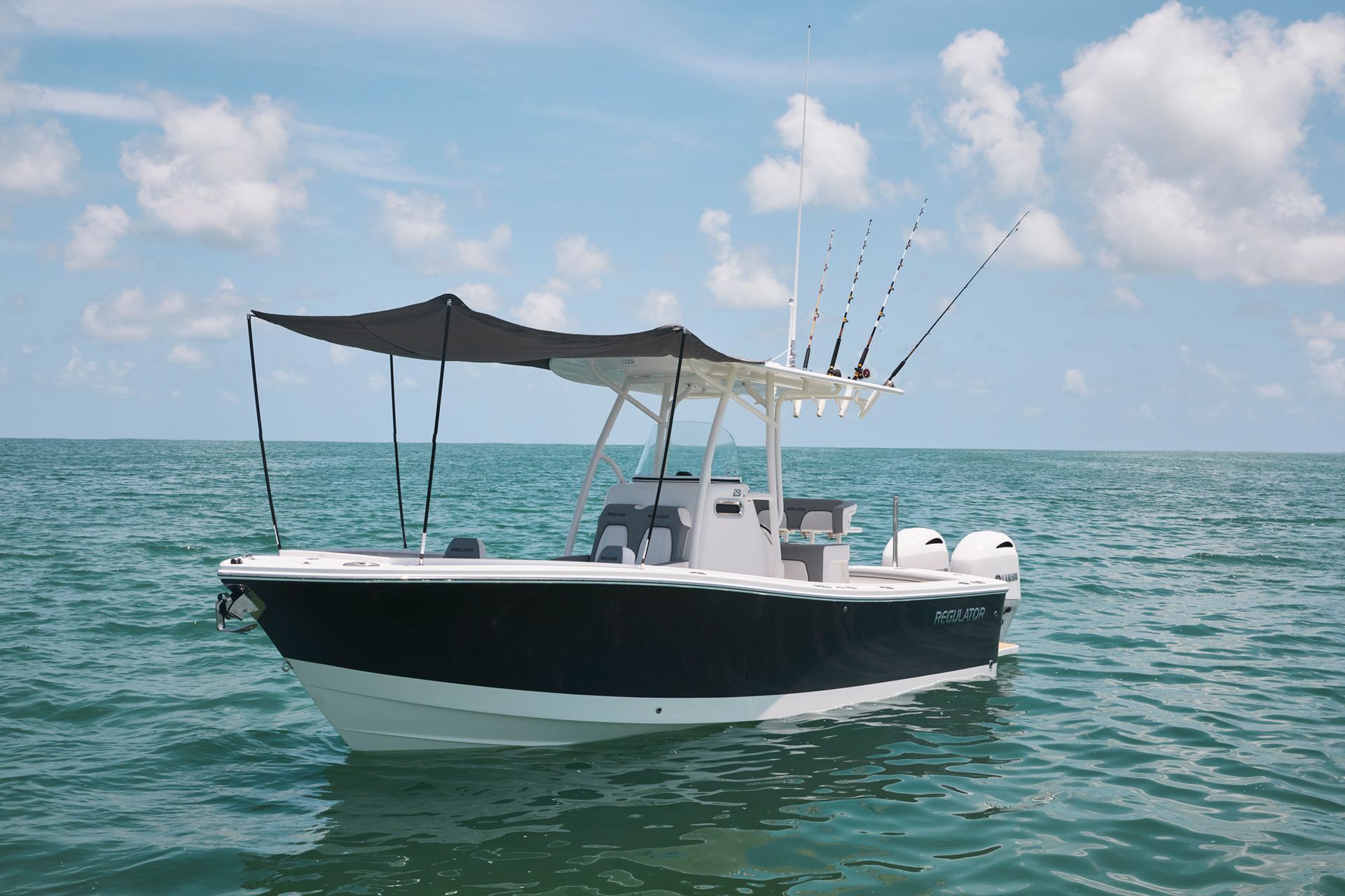 Whether you are ready for an offshore run or a casual day closer to shore, the 23 has you covered, offering unbelievable stability and comfort in true Regulator style. Powered with a single Yamaha 300 or optional twin Yamaha F150s, the Regulator 23 boasts big game fishing benefits, including a transom tuna door, 46-gallon fishbox/livewell, and 350-quart in-deck fishbox, along with a convenient rigging station and plenty of storage. Standard big boat features include our signature T-Top with integrated wraparound windshield for more protection at the helm and factory-installed Garmin® 16 Fish Package. The 23 also features abundant seating, built-in coolers, and a suite of optional amenities, including through stem bow roller with anchor windlass, head with electric tank pump out, removable watersports tow bar, and forward sun shade – ideal for entertaining and discovering the best of life on the water.