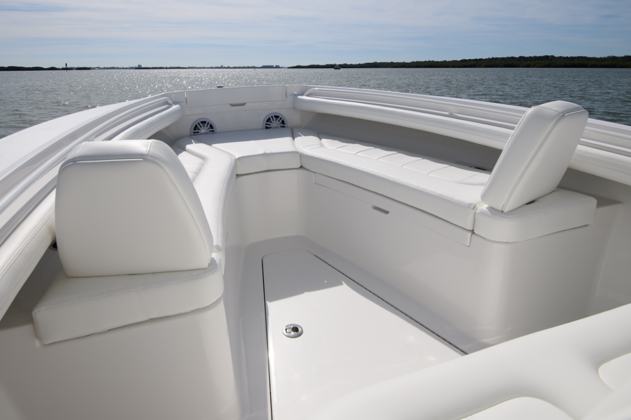 - Fiberglass T-Top with Surfboard Edges, Spreader Lights, and Multi-Colored LED Lights – Complete with Integrated, Vented, Wraparound Windshield