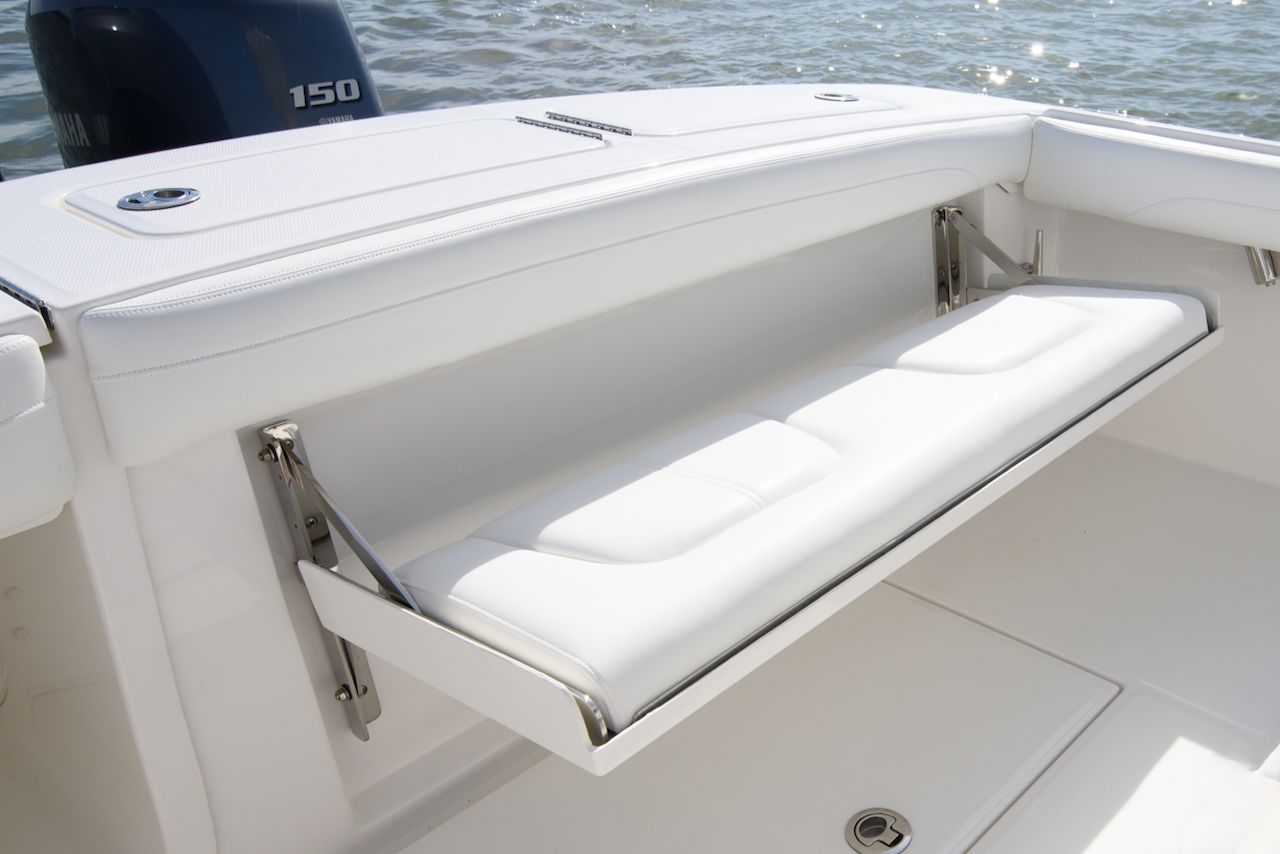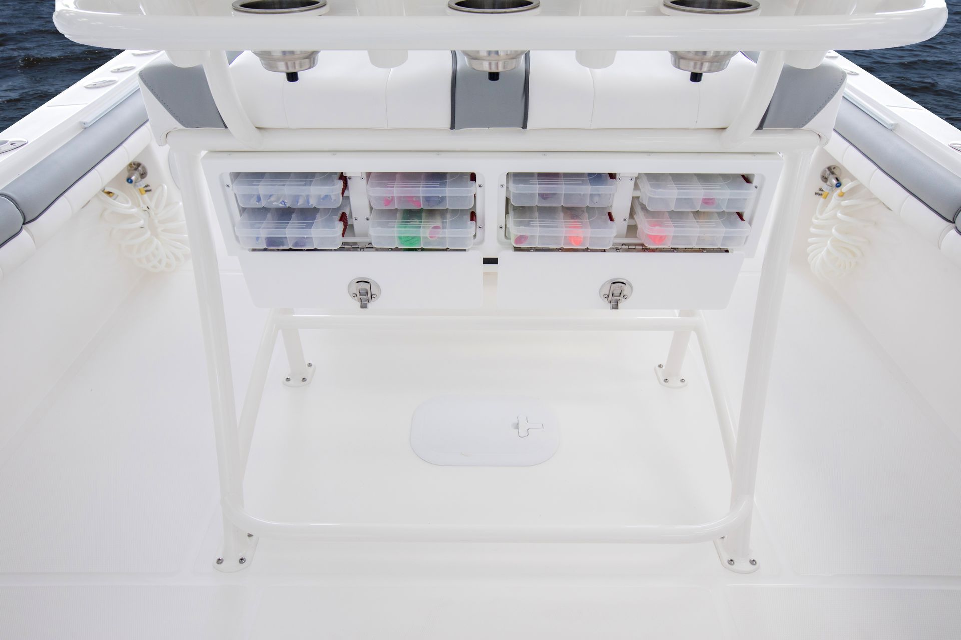 - 2X Deluxe Tackle Center*: Helm Upholstered Console Seating for Two - with Flip-Up Bolster and Individual Folding Footrests with SoftGrip Foot Rail; Seatback Rocket Launcher with Cup Holders; (2) Tackle Drawers; (8) Medium and (2) Large Plano® Trays in Cabinet; and Knife/Hook/Cup Holders