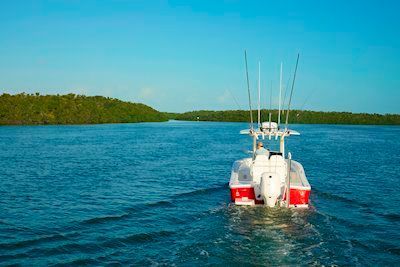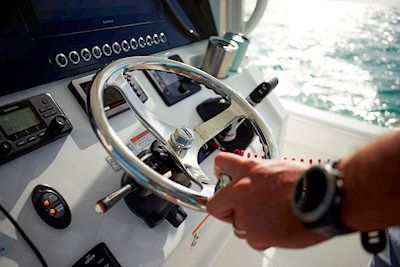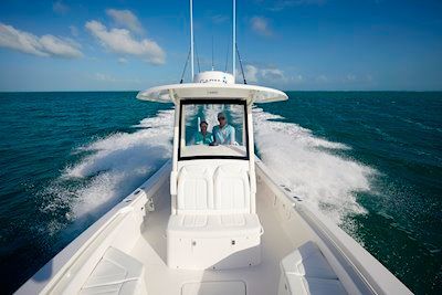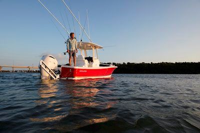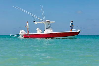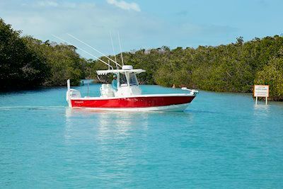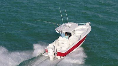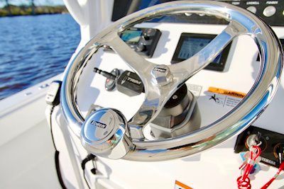 - Single White Yamaha XF425 4-Stroke Engine with DES Tilt Helm, DEC, and EX Autopilot with Waypoint Deceleration