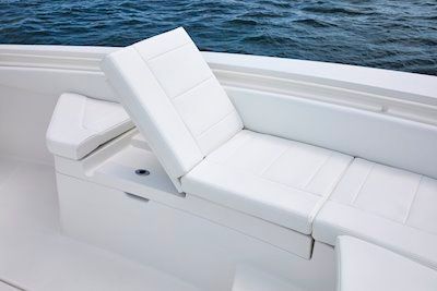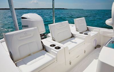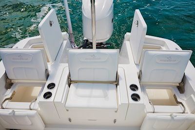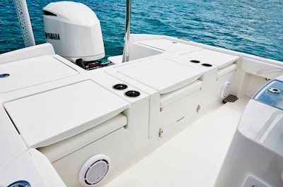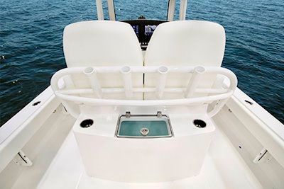 - Deluxe Tackle Center with 32 gal. Livewell: Helm Upholstered Console Seating for Two w/ Flip-up Bolster, Individual Footrests, Seatback Rocket Launcher, (2) Cup Holders, 32 gal. Livewell, and Tackle Storage