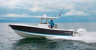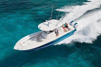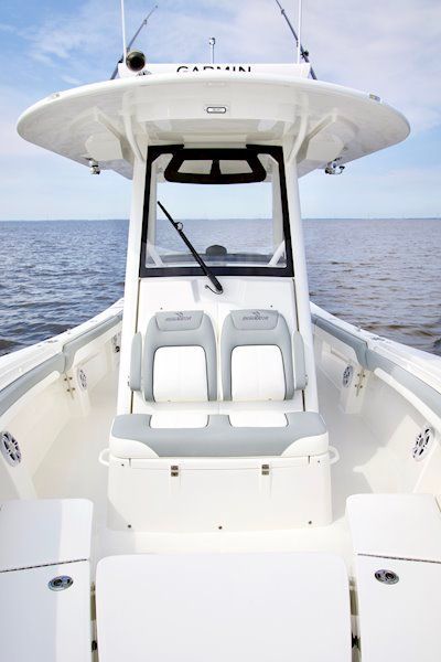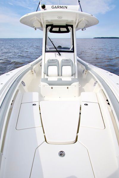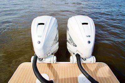 - Twin White Yamaha XF425 4-Stroke Engines with DES Tilt Helm, DEC, and EX Autopilot with Waypoint Deceleration