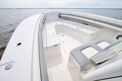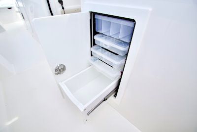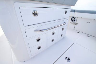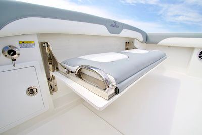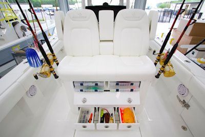 - 3X Deluxe Mezzanine Tackle Center*: Features Aft-Facing Mezzanine Seating for Two with Recessed Footrest, Folding Armrests with Cup Holders, and Tackle Storage (Compatible with Seakeeper® 2 Option)