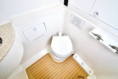 - Stand-Up Head Compartment with Electric Head, 6 gal. Holding Tank, Interior Lighting, Mirror, and Electric Tank Pumpout
