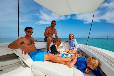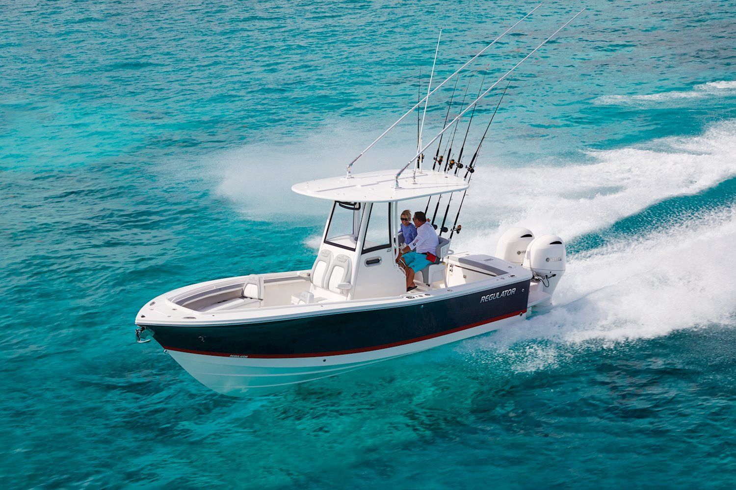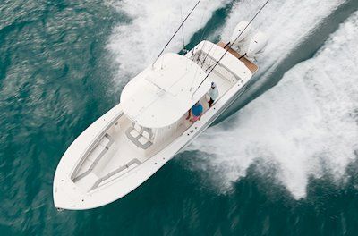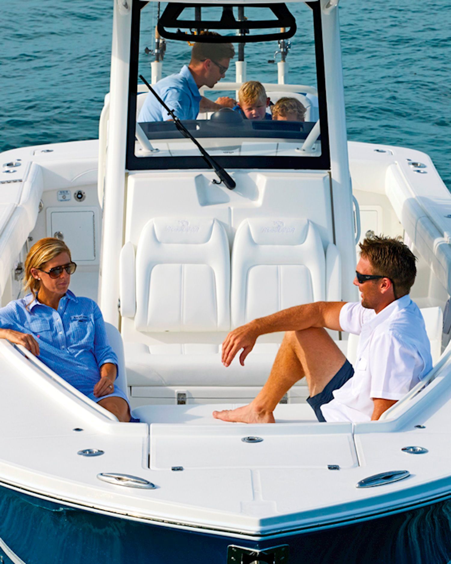 Welcome aboard the fastest boat in our fleet – reaching top speeds of 64 MPH, thanks to twin Yamaha 425s. Yamaha Helm Master® EX option gives you the power and flexibility to handle beautifully in any waters – and Seakeeper® 2 adds an extra element of stability offshore. Ready to fish? The massive cockpit, oversized tackle center, fishbox/livewell action, and optional outrigger bases with 22’ Carbon Fiber collapsible poles and double rigger kit deliver everything you need for a serious day of sportfishing. Upgrade to the 3X Deluxe Mezzanine Tackle Center for additional seating, storage, and dual-flanking rocket launchers that keep your rods at hand when the bite is hot. No matter how you outfit your ride, you’ll have plenty of deck space and offshore comforts including the starboard boarding and dive door, flip-up forward seat backrests, and optional forward and rear sun shades to keep you cool in any waters.