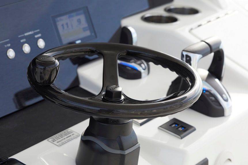 - F300 Helm Master® EX Option: Triple White Yamaha F300 4-Stroke Engines with DES Tilt Helm and DEC – Plus Helm Master® EX Joystick with Multimode Set Point™, EX Autopilot with Waypoint Deceleration, and Electronic Key Switch with Wireless Fob