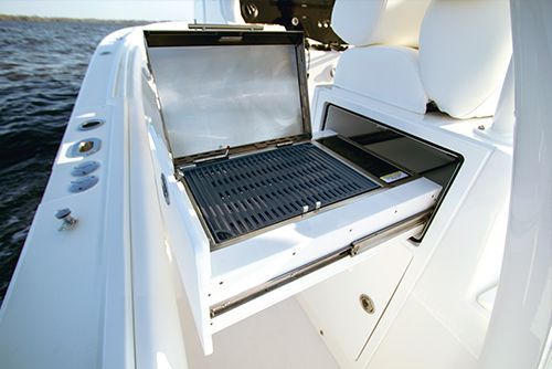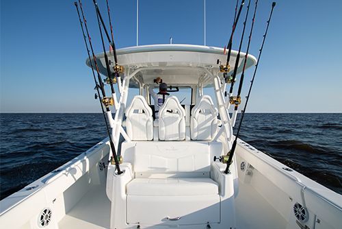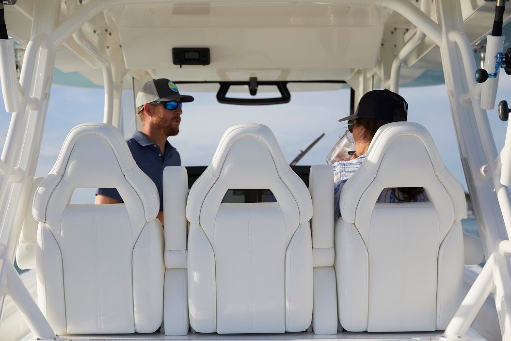 - 3X Deluxe Mezzanine Tackle Center*: Features Aft-Facing Mezzanine Seating for Two with Recessed Footrest, Folding Armrests with Cup Holders, and Tackle Storage (Compatible with Seakeeper® 2 Option)