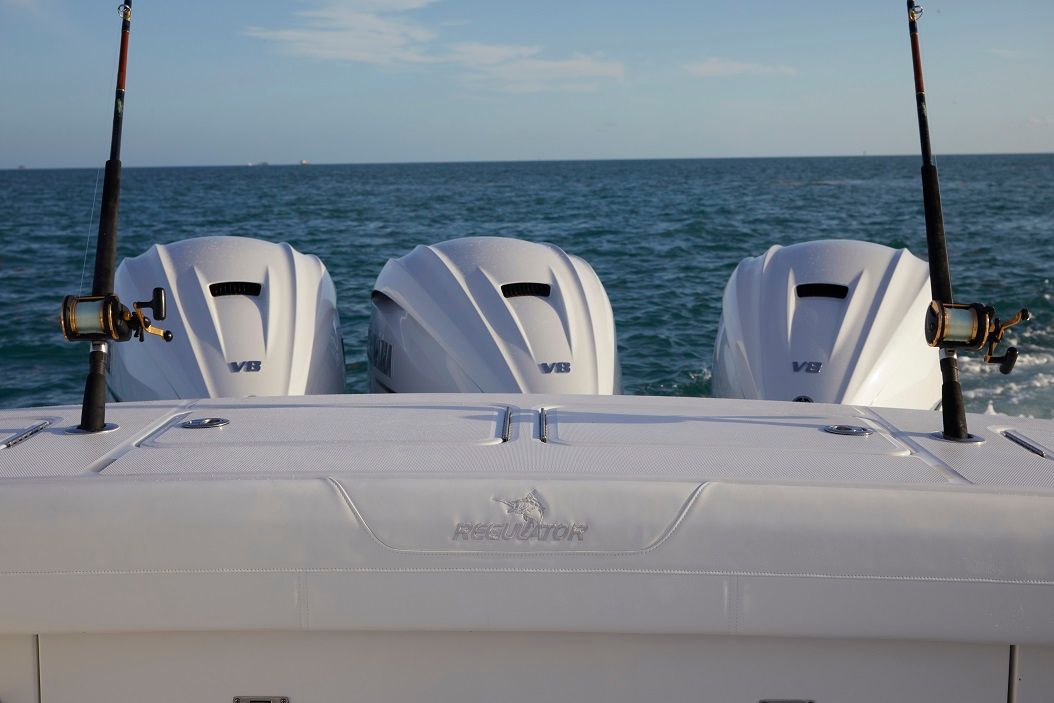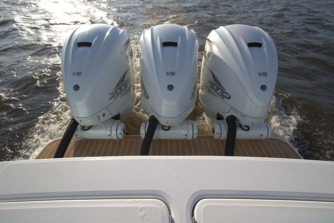 - Triple White Yamaha F300 4-Stroke Engines with DES Tilt Helm, DEC, EX Autopilot with Waypoint Deceleration, and Electronic Key Switch with Wireless Fob