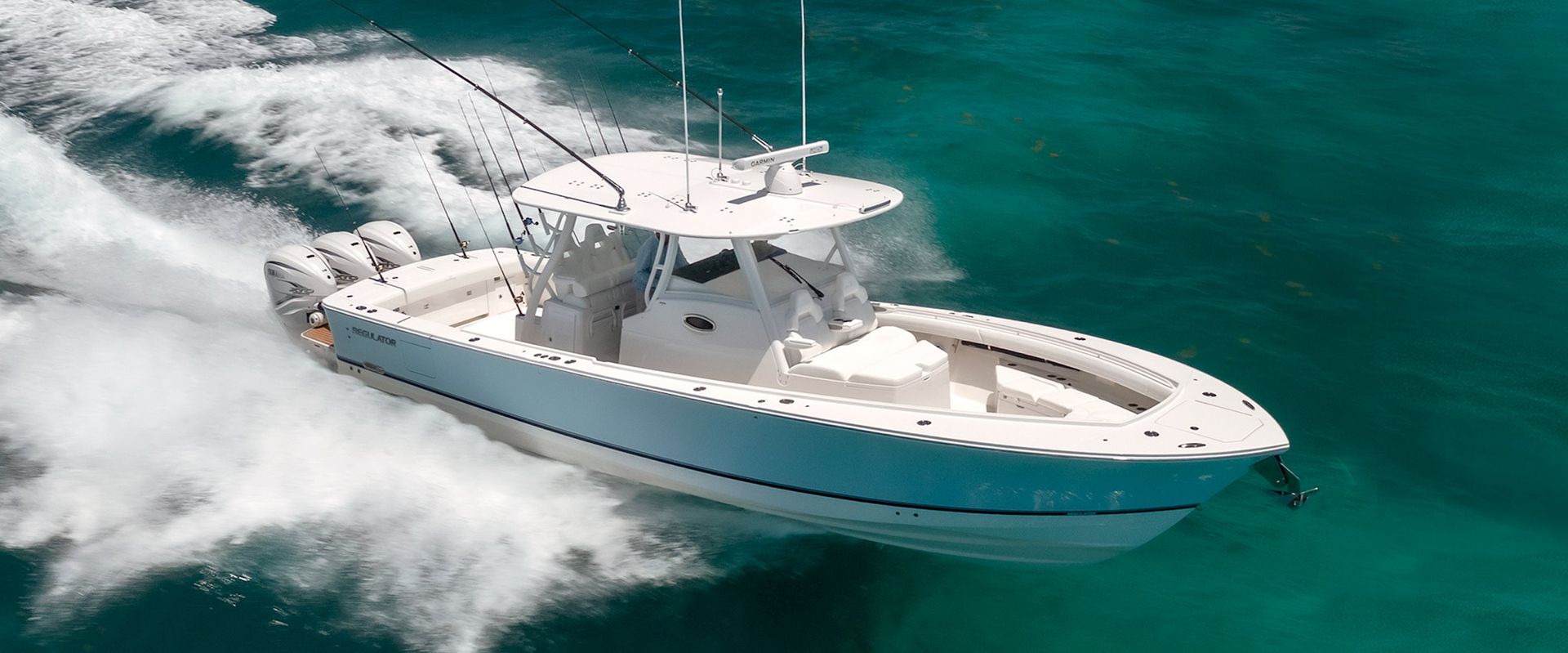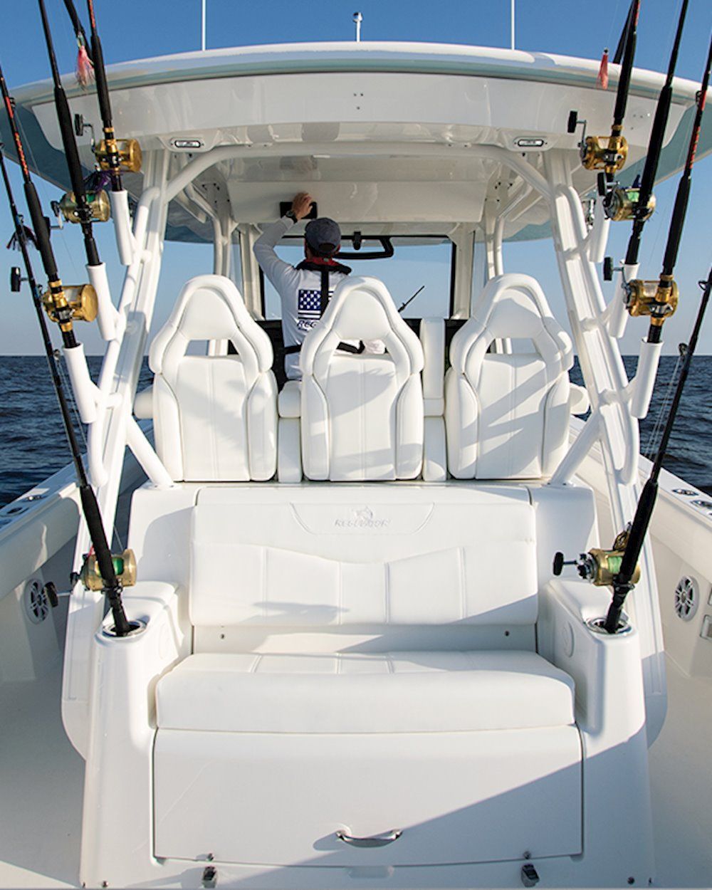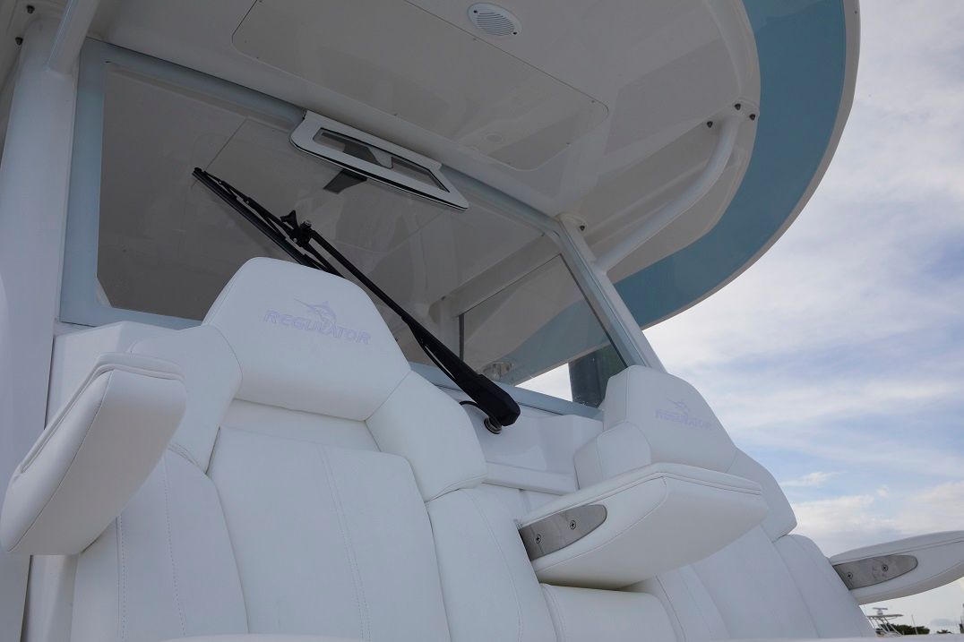 The new Offshore Command Center features Garmin® Multi-Function Display with Digital Switching and Monitoring, along with proprietary Regulator MyHelm™ interface to seamlessly and intuitively connect key functions in one application – with wireless key fob to trigger lighting, batteries, and more as you approach or disembark with the touch of a button. The E-Series Seating & Tackle Center features a raised deck with triple helm seating, plenty of tackle storage, and six rocket launchers – plus aft-facing bench seat for two, flanked by built-in armrests with Cup Holder Rod Holders. Opt for E-Series Galley Upgrade with electric grill and refrigerator to entertain with ease. Beneath the bench seat, you’ll find the illuminated pump room with fuel tank access, optional Seakeeper® 5 and other systems, as well as extra storage.