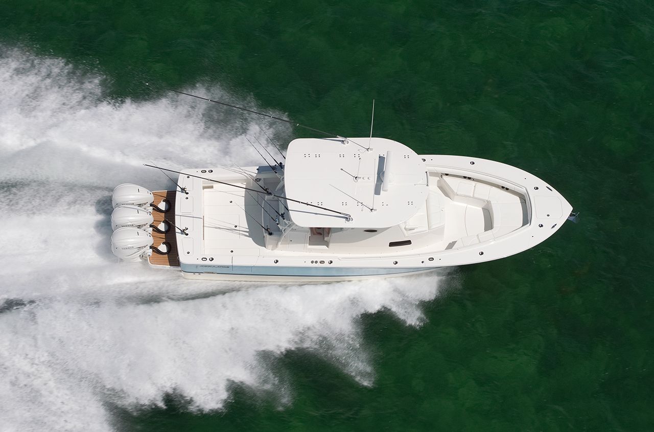 Triple Yamaha XF425s. 507-gallon fuel capacity. Digitally-enhanced helm station. Triple helm seating with aft bench seat and pump room. Optional Tower. Deluxe cabin with queen berth, galley, head...and so much more. Our expert engineers and craftsmen have planned every inch of this 43-foot-plus ride to deliver fishability, comfort, and convenience at every turn.